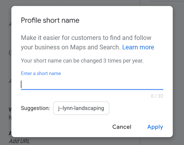 In this step you will need to create a profile short name. A profile short name is a custom name for your business profile. This makes it easier for customers to find you on Google properties such as Search or Maps.